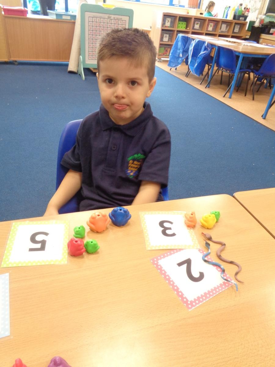 Leah-Rose hunted in the sawdust and found magic beans. She then put the correct quantity by each numeral.